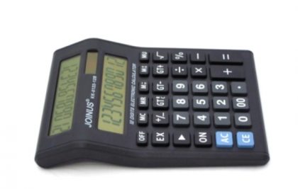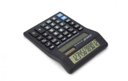 Közepes méretű asztali számológép ferde kijelzővel, alapvető matematikai műveletekkel