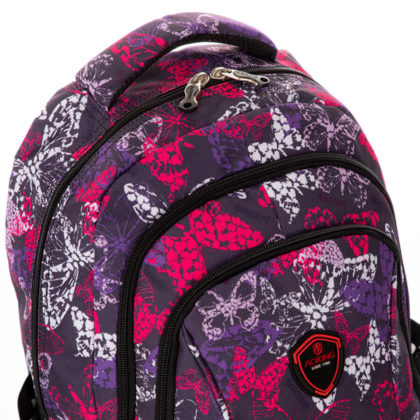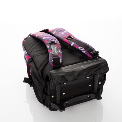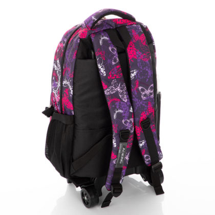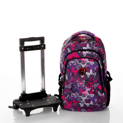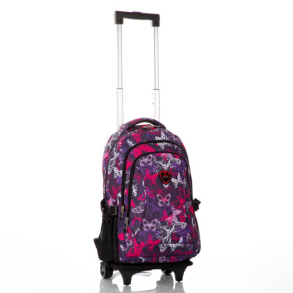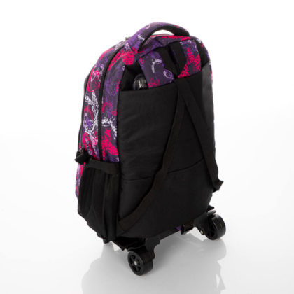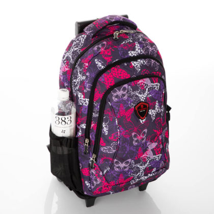 Gurulós iskolatáska/hátizsák. Három nagy tároló rekesze van, ezek mind cipzárasak.