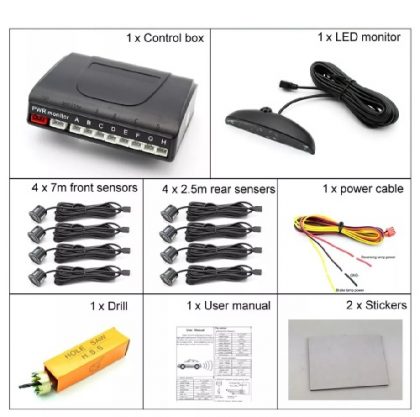 A csomagban találsz egy központi egységet, 4 darab nagyérzékenységű szenzort, illetve egy fúrófejet, amivel akár te magad is kialakíthatod lökhárítódban a szenzorok helyét.
