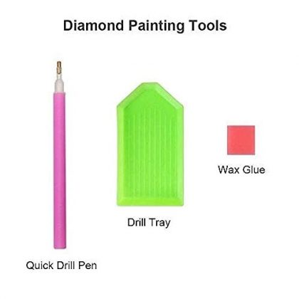 A képen látható vászonra előrenyomtatott mintázatot egy pálca, ragasztó, és apró gyémántok segítségével lehet kirakni.