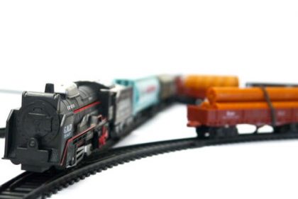 Elemes vasút készlet vagonokkal, mozdonnyal, sínpályával.