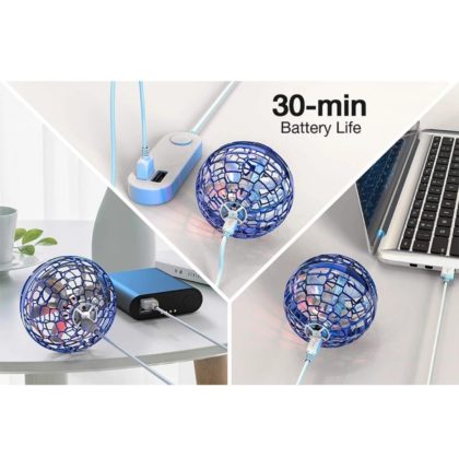 Repülés közben körbeforog és világít is, kezeiddel terelgetheted, hogy merre menjen. Teljesen feltöltött akkumulátorral 8-10 percig használható folyamatosan. A játék 9 cm átmérőjű, így pont elfér a tenyeredben, rugalmas, strapabíró vázában a véletlen ütközések, leesések nem tesznek kárt, és a játék sem tör össze semmit, de vigyázz rá, hogy ne szorítsd meg erősen. A mellékelt USB kábel segítségével kb. 30 perc alatt feltöltheted.
