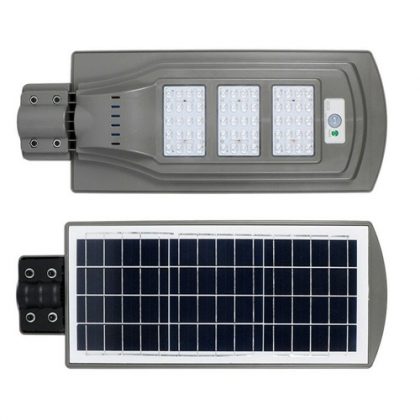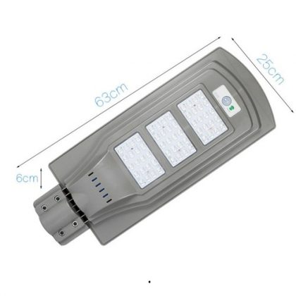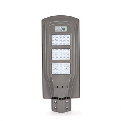 60W teljesítményű rendelhető, szürke házas napelemes utcai LED világítás. Beépített fény és mozgásérzékelő. Szürkületkor a lámpa automatikusan bekapcsol alap fényerővel, mozgás esetén teljes fényerő válik 30 másodpercig. Teljesen gondozottmentes, telepítéskor figyelembe kell venni a fényviszonyokat, megfelelő töltés eléréséhez.