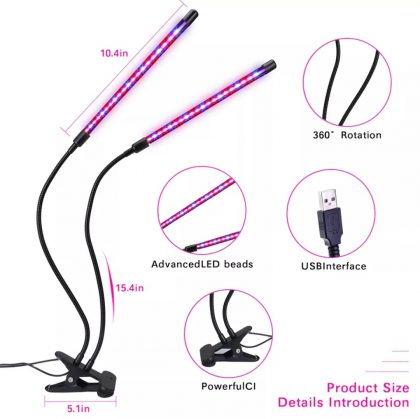 Növény nevelő LED lámpa 2 fejű hajlítható csíptethető DC 5V