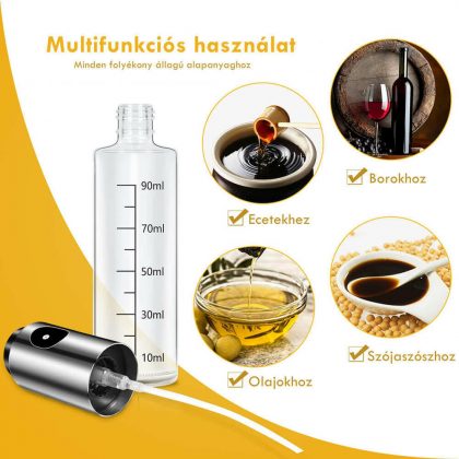 Minden háziasszony tapasztalta már, hogy sütés-főzés közben több olaj kerül a serpenyőbe/fazékba, mint amennyit szeretnénk. Az olajspray segítségével annyi olajat lehet felvinni az ételre, mint amennyit korábban terveztek. A spray használatával nem csak egészségesebben főzhetünk, de pénzt is spórolhatunk. Az olajon kívül ecetet is adhatunk hozzá, így salátákhoz is használható.