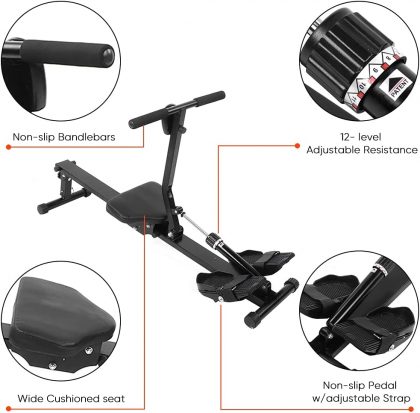 Állítható láb pánt – A lábtámasz állítható pántjait a lábához állíthatja, és a stabilizátor segítségével szükség szerint beállíthatja az evezős gépet. Ez az edzőeszköz lehetővé teszi, hogy enyhítse a napi stresszt.